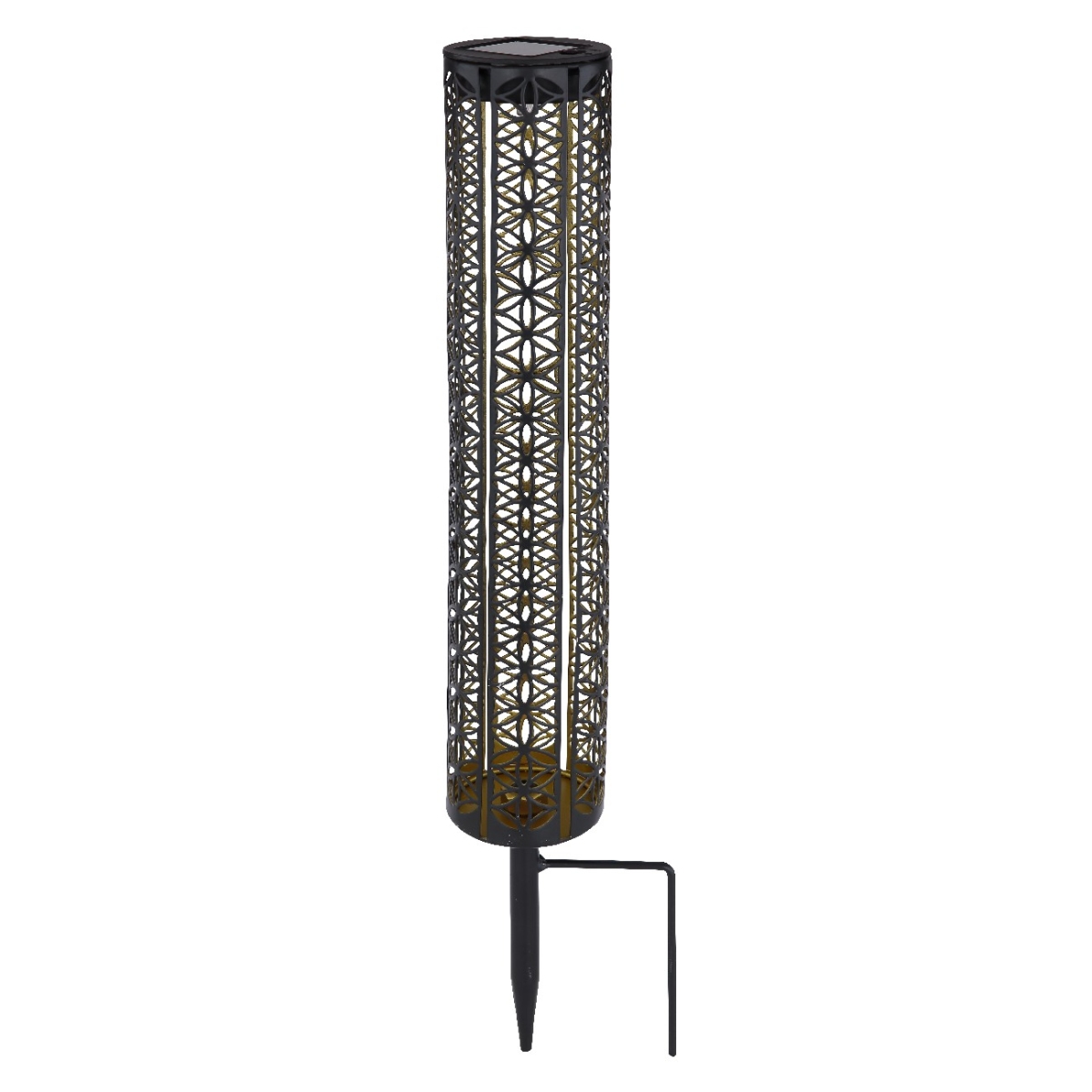 Ova cilindrična solarna lampa (ø 7cm) idealna je za vašu baštu zbog svoje IP44 zaštite. Uz pomoć oštrog vrha na dnu, solarna lampa od 46 cm može se lako postaviti u meko tlo. Metal je crn spolja i zatamnjen zlatnim iznutra. U kombinaciji sa prijatno toplom belom svetlošću (3000 Kelvina) LED sijalice na solarno napajanje, doprinose prijatnoj atmosferi u vašem otvorenom prostoru.