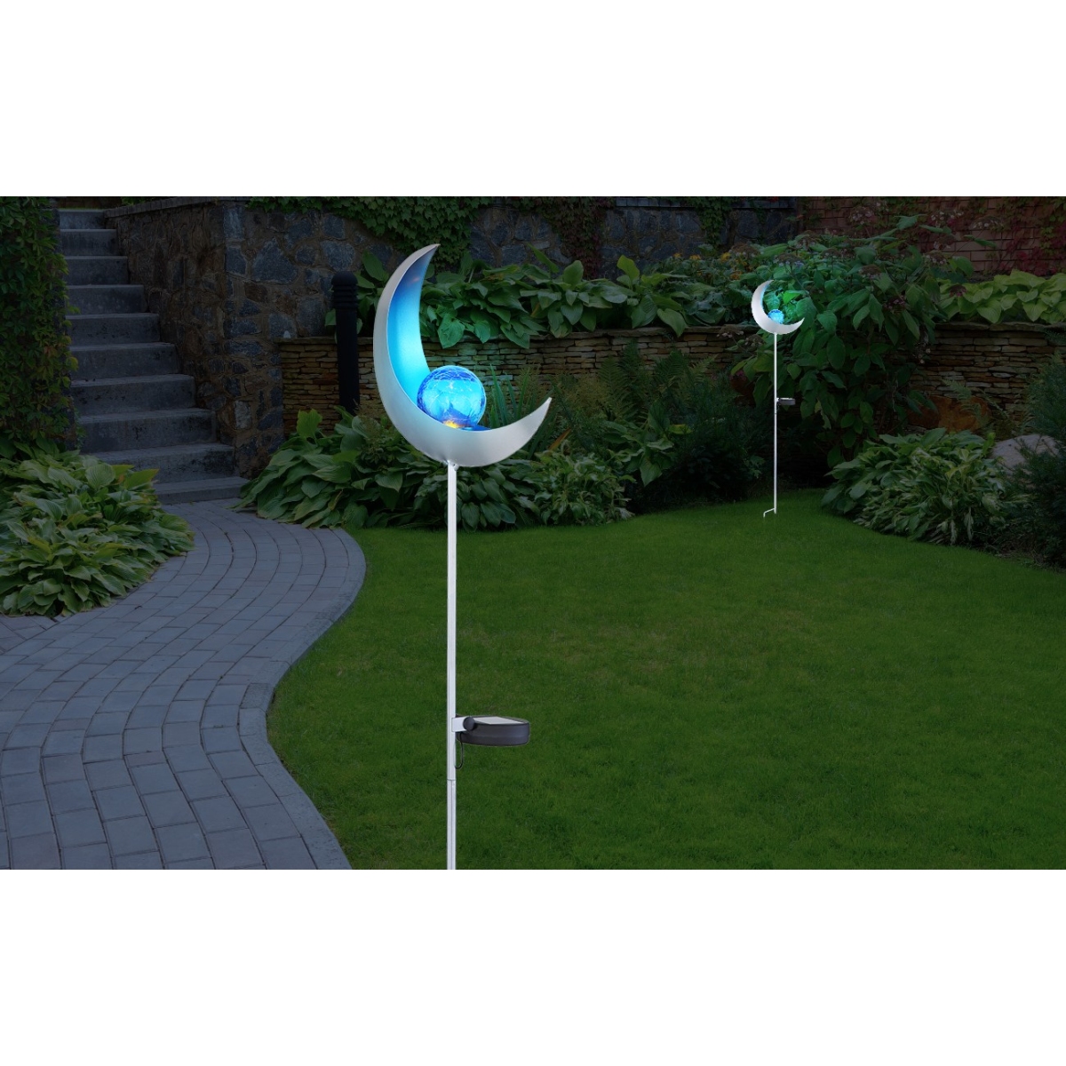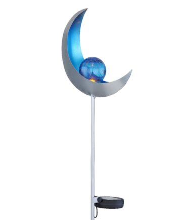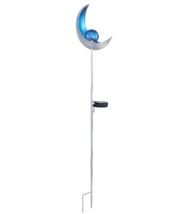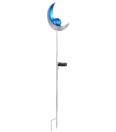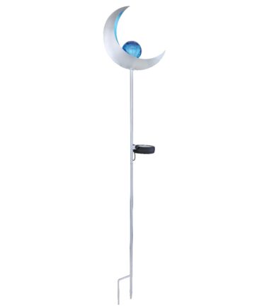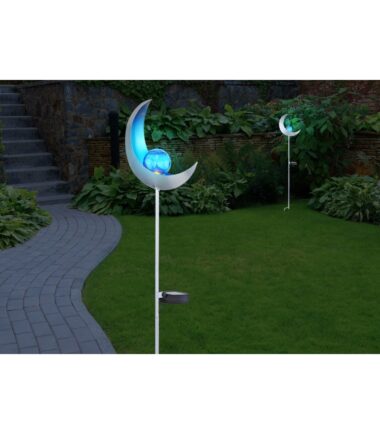 Ova solarna lampa ističe se svojim dizajnom u obliku polumeseca napravljenim od metala srebrne boje. Uz pomoć vrha za uzemljenje, solarna lampa od 90 cm može se lako postaviti u meko tlo. LED sijalica na solarni pogon u sredini plavo obojenog metala obezbeđuje hladno belo svetlo (6500 Kelvin) i okružena je staklenom kuglom u prelepom pucketajućem izgledu. Uz ovo solarno svetlo možete napraviti predivan ambijent u vašem otvorenom prostoru.