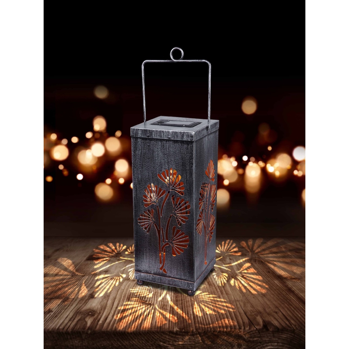 Ova metalna solarna lampa (110x110mm) impresionira svojim dekorativnim starinskim dizajnom. Solarna svetlost prodire kroz romantične otvore u obliku cveta sa sve četiri strane. Bilo da stoji ili da visi, ova solarna lampa osvetljava vaš prostor. Opremljena je LED sijalicom od 0.06W, može da svetli do 6 sati. Baterija se puni preko dana, zatim sija u mraku svojom toplom belom svetlošću od 3000K. Sa klasom zaštite IP44, ova solarna lampa je idealna za spoljašnju upotrebu.