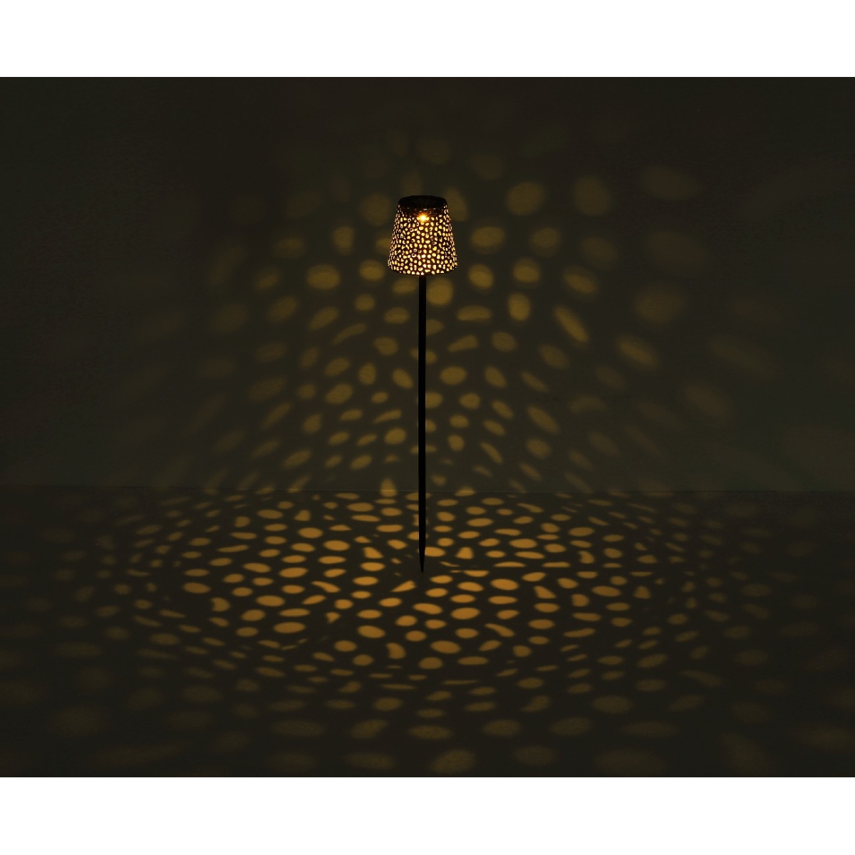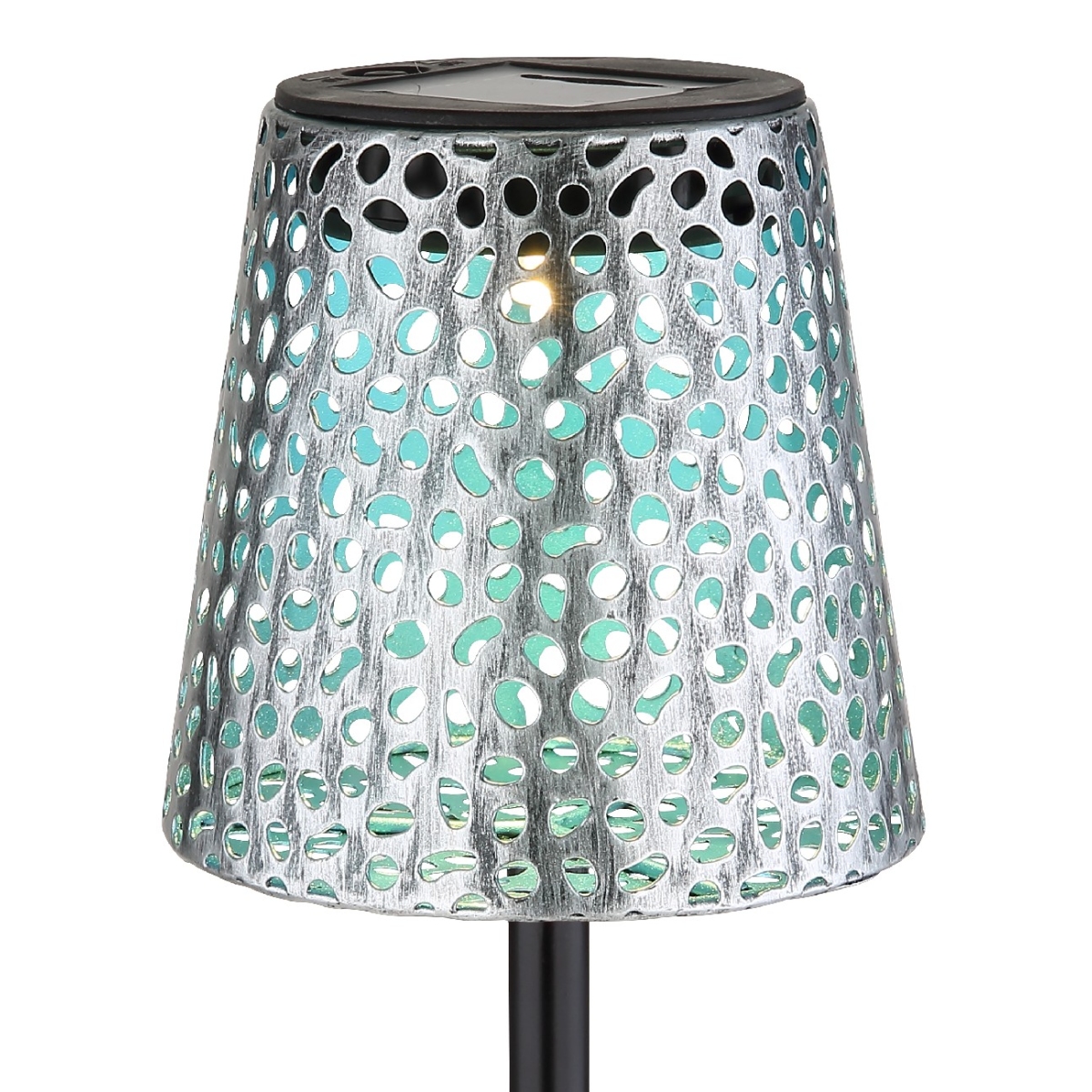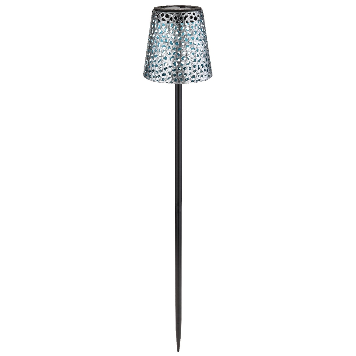 Ova velika solarna lampa inspiriše prelepim dizajnom. Crni mat metalni štap prodire iz zemlje i završava se na visini od 70 cm sa oblikovanim srebrnim abažurom sa odličnim ukrasnim detaljima. Pomoću integrisanog LED-a obezbeđuje 3000 Kelvina toplu belu svetlost i tako osigurava prijatnu atmosferu. Model ima prekidač za uključivanje ili isključivanje svetla. Zbog IP44 stepena zaštite od prskanja vode, savršen je za upotrebu na otvorenom.
