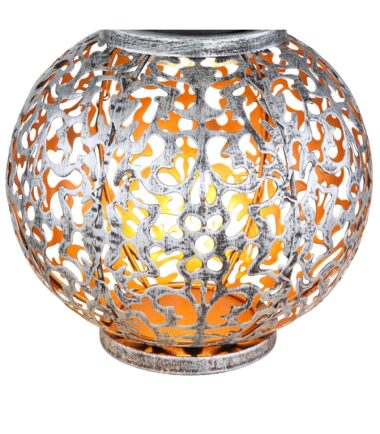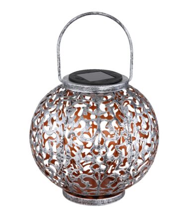 Ova okrugla solarna lampa napravljena od metala srebrne boje (ø 20 cm) može se fleksibilno koristiti u vašem otvorenom prostoru. Ima kuku koja omogućava da joj se dive i u visećem i stojećem položaju (npr. na stolovima). Elegantna šara na metalnim stranama projektovana je ka spolja od strane LED sijalice na solarni napajanje. Prijatno toplo belo svetlo (3000 Kelvina), LED sijalice takođe stvaraju prijatnu atmosferu u vašem vrtu, terasi ili balkonu.
