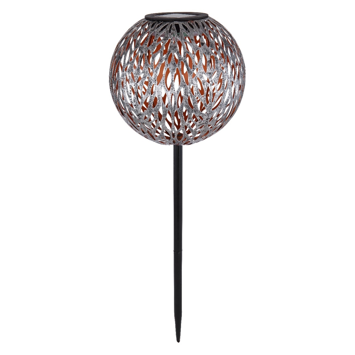 Ovom LED lampom od metala dočarali ste bajkoviti ambijent u vašoj bašti ili na balkonu. Sferna solarna lampa u srebrnoj boji stvara impresivnu igru svetlosti zahvaljujući izbušenom metalu i unutrašnjosti u boji zlata. Lampa je na solarno napajanje, ima stepen zaštite IP44 i ugrđenu bateriju, koja ima vreme rada od 8 sati kada se u potpunosti napuni. Lampu možete lako pričvrstiti na zemlju u svom otvorenom prostoru i na taj način postaviti savršene svetlosne akcente u vašoj bašti uz pomoć ove rustične solarne lampe.