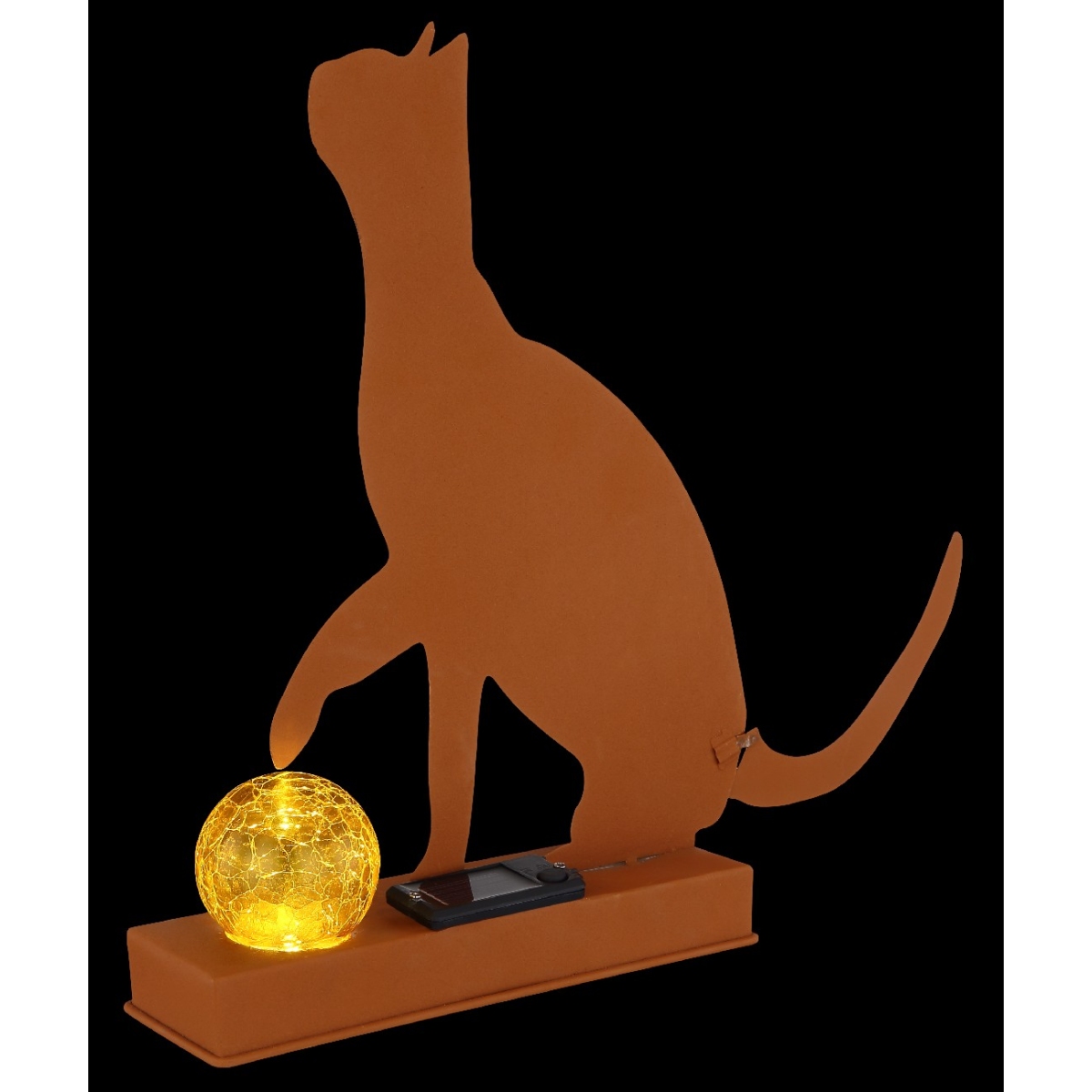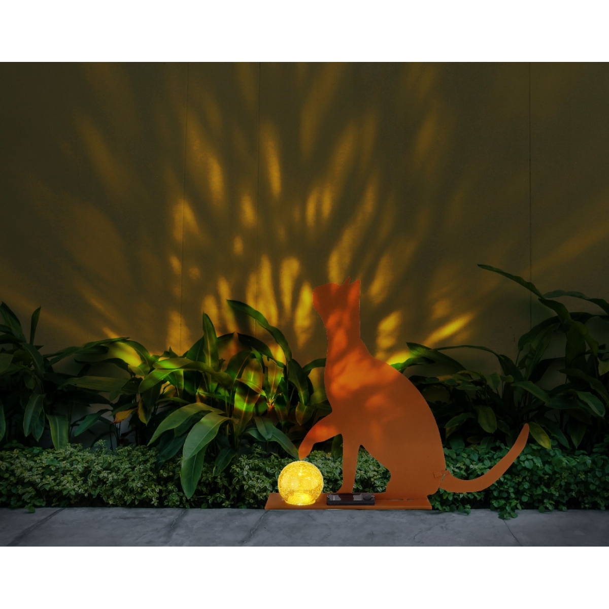 Ovo prelepo solarno svetlo ubeđuje svojim sjajnim dizajnom. Na osnovi u boji rđe (31,5x7cm) nalazi se razigrana mačka visoka 33,5 centimetara u obliku diska sa odličnom staklenom kuglom, koja emituje prijatnu 3000 Kelvina toplu belu svetlost i tako pruža prijatnu atmosferu. Pored toga, lampa ima zaštitu od prskanja vode.