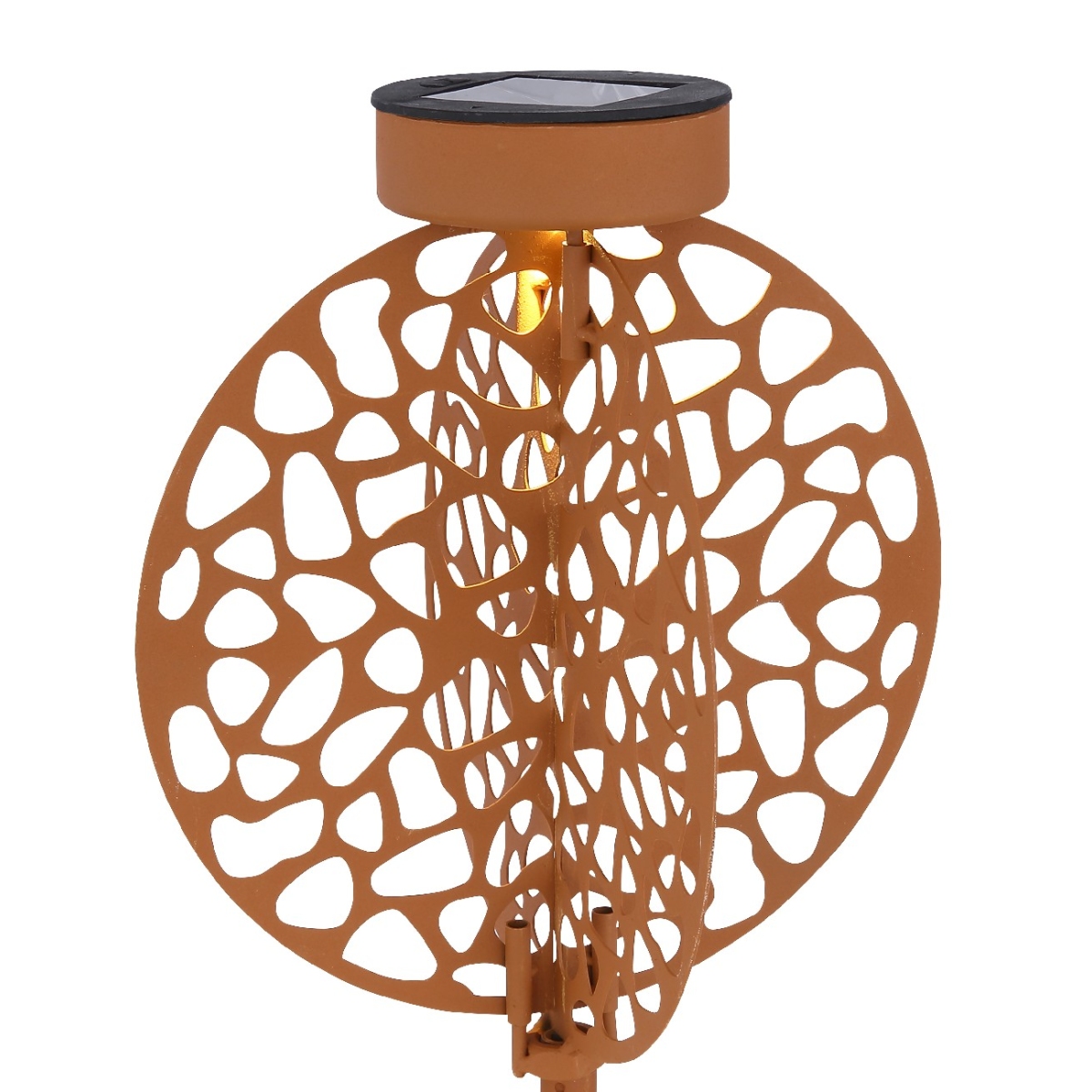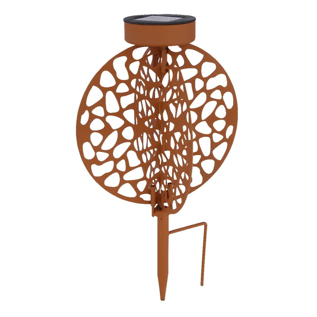 Ova nerđajuća metalna solarna lampa (IP44 ocena) je prelep dodatak vašoj bašti. Uz pomoć oštrog vrha na dnu, može se lako i fleksibilno smestiti u meko tlo. Prijatno toplo belo svetlo (3000 Kelvin), LED sijalice na solarno napajanje sijaju odozgo, dve ortogonalno navučene metalne ploče (ø 20 cm svaka) i na taj način doprinose prijatnom ambijentu u vašem otvorenom prostoru.