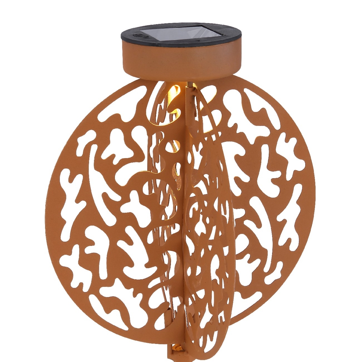 Ova nerđajuća metalna solarna lampa (IP44 ocena) je prelep dodatak vašoj bašti. Uz pomoć oštrog vrha na dnu, može se lako i fleksibilno smestiti u meko tlo. Prijatno toplo belo svetlo (3000 Kelvina), LED sijlaice na solarno napajanje sijaju odozgo na ekstravagantnu šaru u dve ortogonalno navučene metalne ploče (ø 20 cm svaka) i na taj način doprinose prijatnom ambijentu u vašem otvorenom prostoru.