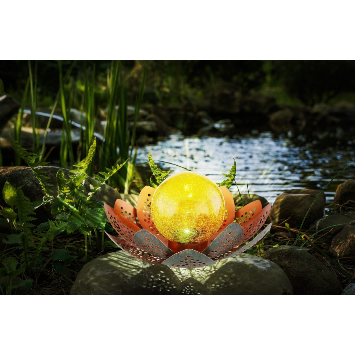Ova solarna lampa u egzotičnom cvetnom obliku je divan dodatak svakom otvorenom prostoru. Na sredini lampe nalazi se staklena kugla u boji ćilibara okružena laticama zelenog i zlatno obojenog metala. Pretvorite svoju baštu u oazu sa ovim solarnim lotos cvetom. Ova solarna lampa takođe će privlačiti pažnju i tokom dana, kada postavlja scenu kao prelep dekorativni element za vaš prostor na otvorenom. Pored toga, ovo spoljašnje svetlo se napaja isključivo solarnom energijom i postiže vreme rada do 8 sati kada je baterija u potpunosti napunjena. Sa IP44 zaštitom, ovaj proizvod je otporan na prskanje i idealan je za spoljašnju upotrebu.