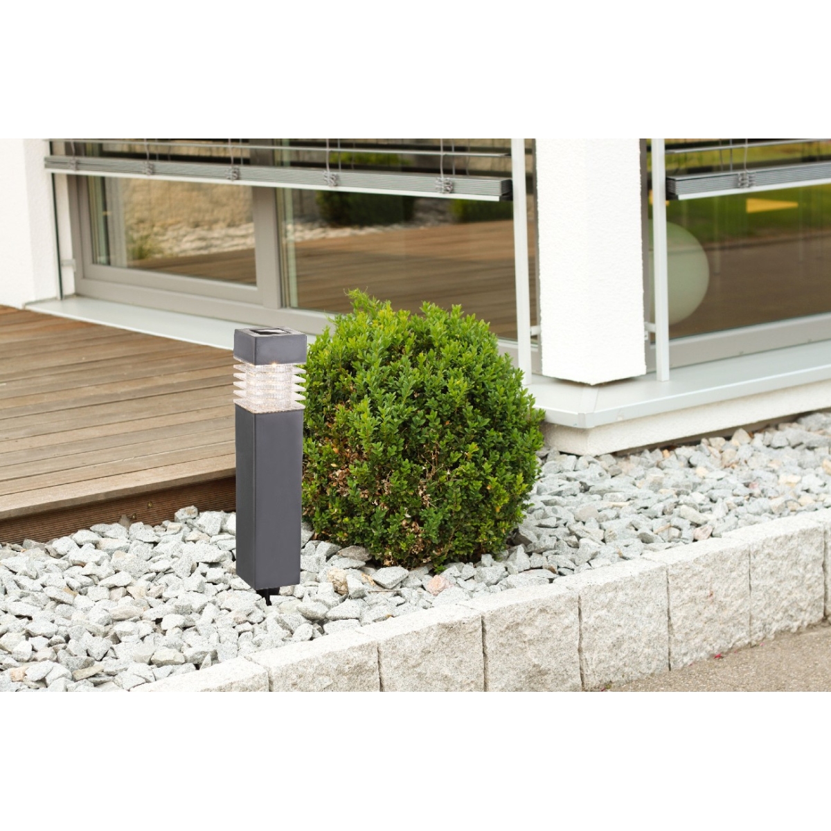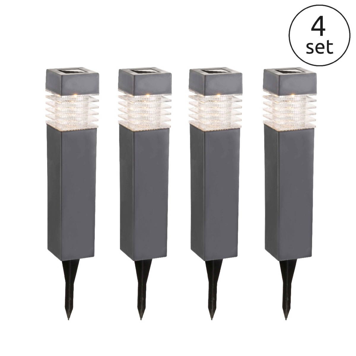 Pravougaone solarne lampe dužine 38,5 cm, set od 4 komada, napravljene su od sive i satinirane gotove plastike. Ugrađene baterije puštaju LED sijalice (svaka 0,06W) da sijaju maksimalno osam sati uz prijatno toplo belo svetlo. Sa svojom IP44 zaštitnom klasom, apsolutno su pogodni za korišćenje na otvorenom.
