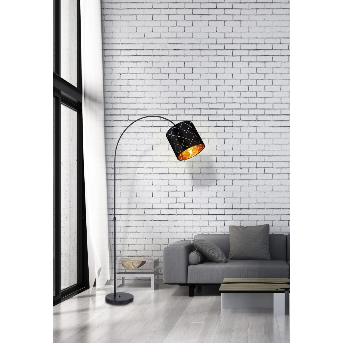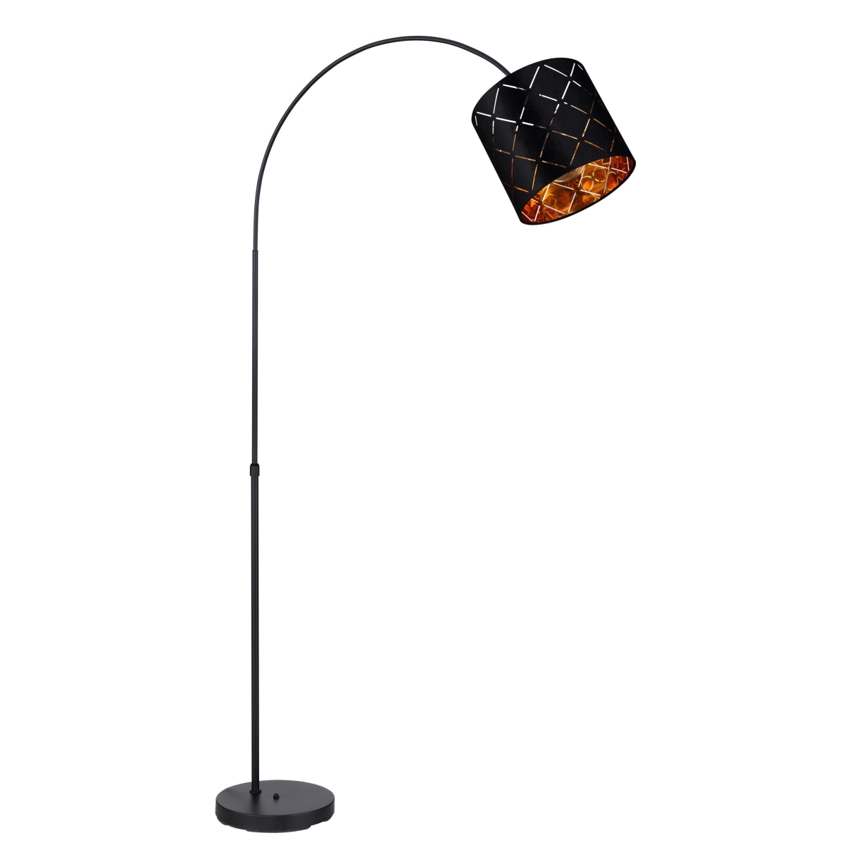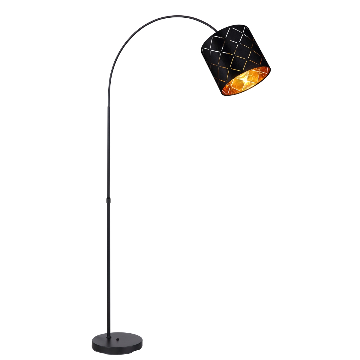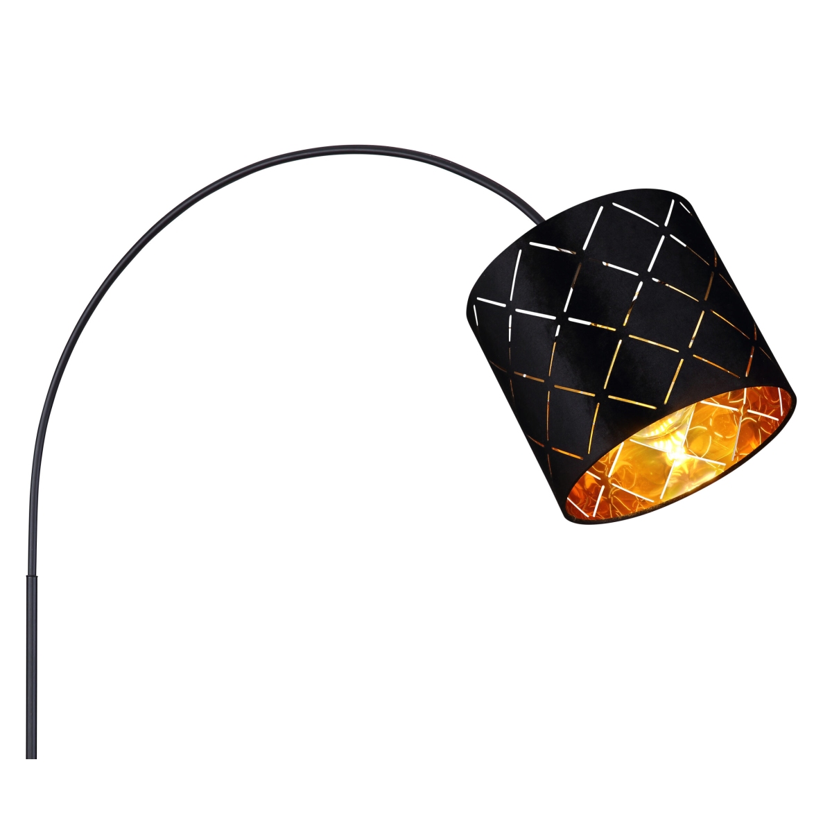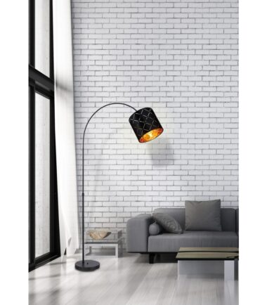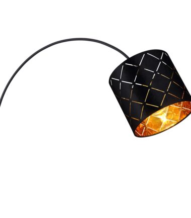 Ova podna lampa iz serije SUNNA je divan dodatak vašem enterijeru. Podna lampa dužine 195 cm sastoji se od okrugle metalne podloge na koju je fiksirana crna metalna šipka savijena nagore. Ima cilindrični baršunasti abažur sa šarom i zlatnim unutrašnjim delom, može biti opremljena E27 sijalicom po vašem izboru. To vam pruža mogućnost da pojedinačno odredite boju svetla i jačinu. Pored toga, podna lampa ima prekidač sa kojim se može zgodno uključiti i isključiti. Sa ostalim modelima iste serije možete upotpuniti celokupnu sliku u svoja četiri zida i obezbediti elegantan ambijent.