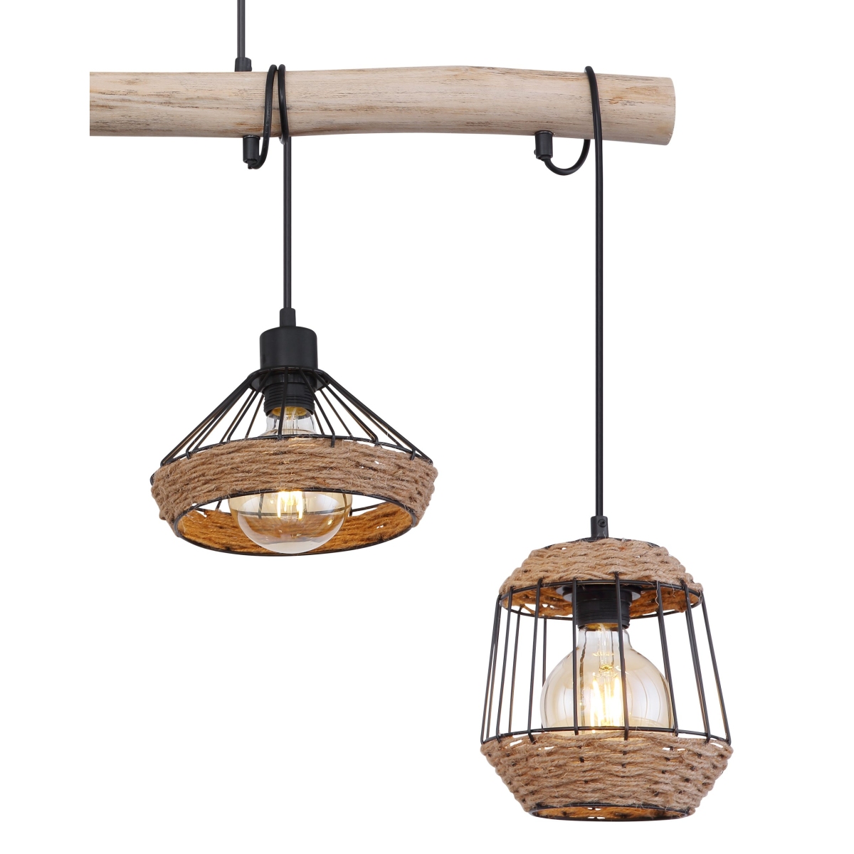 Ova visilica dužine 105 cm SURRI je idealna za postavljanje preko trpezarijskog stola, koji potom doživljava jednoobrazno osvetljenje. Visina lampe može da se podesi i do 120 cm tokom instalacije zahvaljujući kablovima obmotanim oko drvenog stuba. Pored toga, ima četiri različito oblikovane, crno-mat metalne grane, koje su na nekim mestima umotane u uže konoplje. One mogu biti opremljene E27 sijalicama po vašem izboru, što vam daje mogućnost da pojedinačno odredite laganu boju i jačinu. Pomoću Surri viseće lampe možete postaviti elegantne akcente u enterijeru i upotpuniti celokupnu sliku.