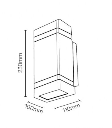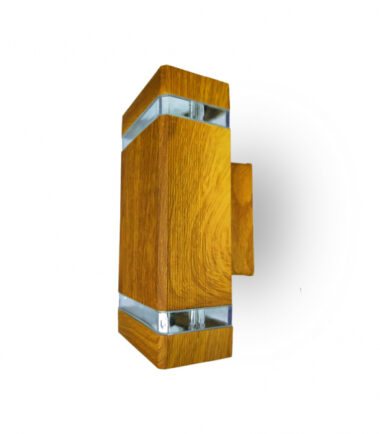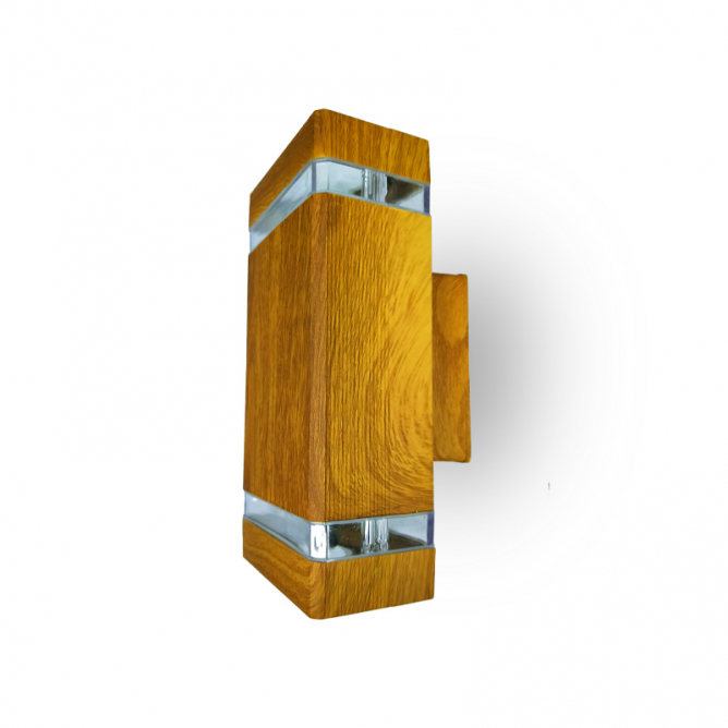 - Zidna svetiljka sa visokom IP zaštitom izrađena od aluminijuma u boji drveta. Poseduje dva sijalična grla, tip GU10. Predviđena je za postavljanje na sve vrste fasada, za terase, vrtove, dvorišta. Svetlosni snop se prostire gore i dole, a boja svetlosti zavisi od odabira samih sijalica.