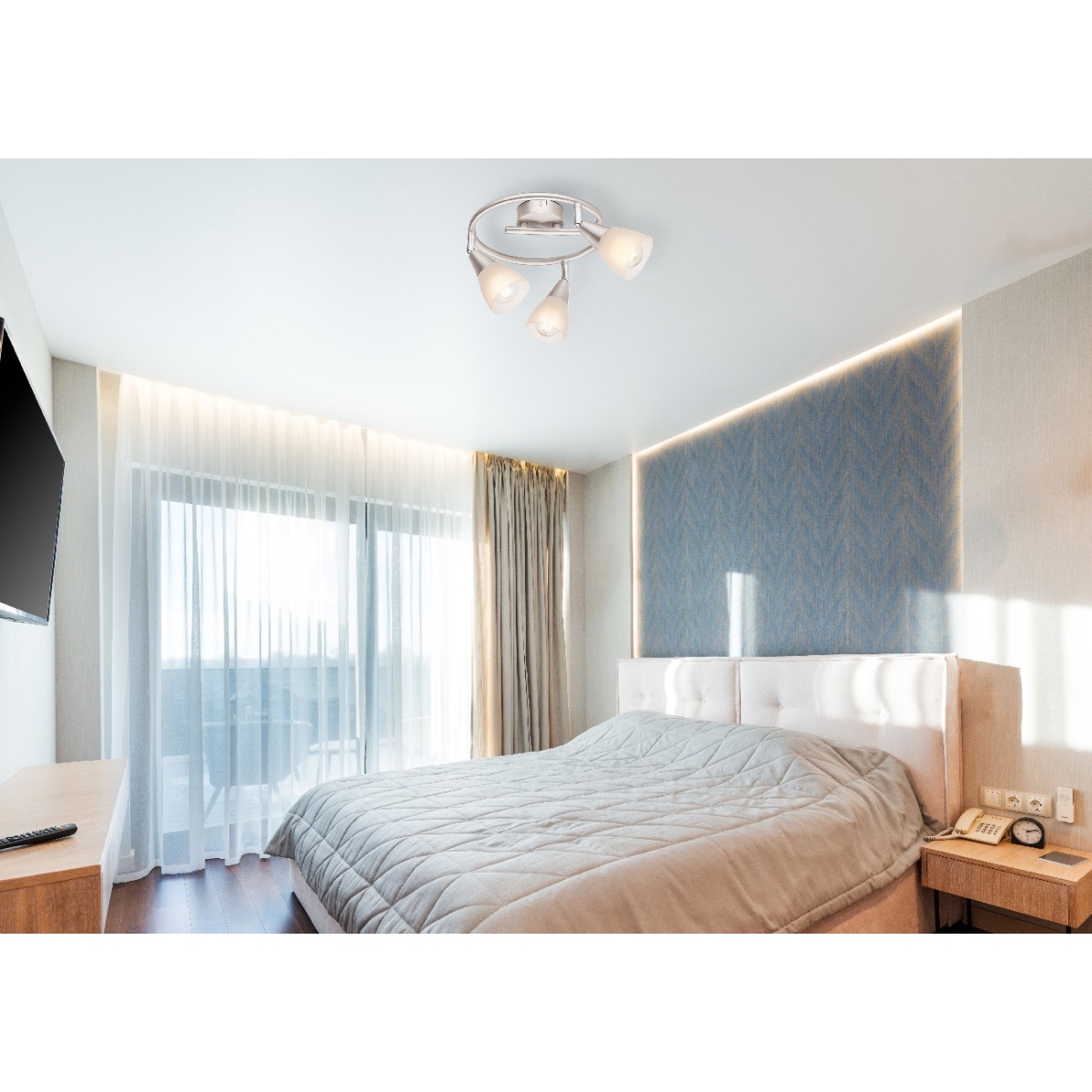 Moderna nikl mat plafonska lampa TADEUS ističe se svojim dizajnom i satiniranim gotovim staklom. Na osnovi e-oblika (Ø29cm) su prikačena tri prelepa spota, svaki sa E14 grlom. Odabirom sijalica po želji, a samim tim i boju svetla i svetli intenzitet možete odrediti vi (max.40W). Zbog njihove uštede energije i dugovečnosti, preporučujemo LED sijalice i uz ostale lampe iste serije možete upotpuniti sliku u svom životnom boravku.