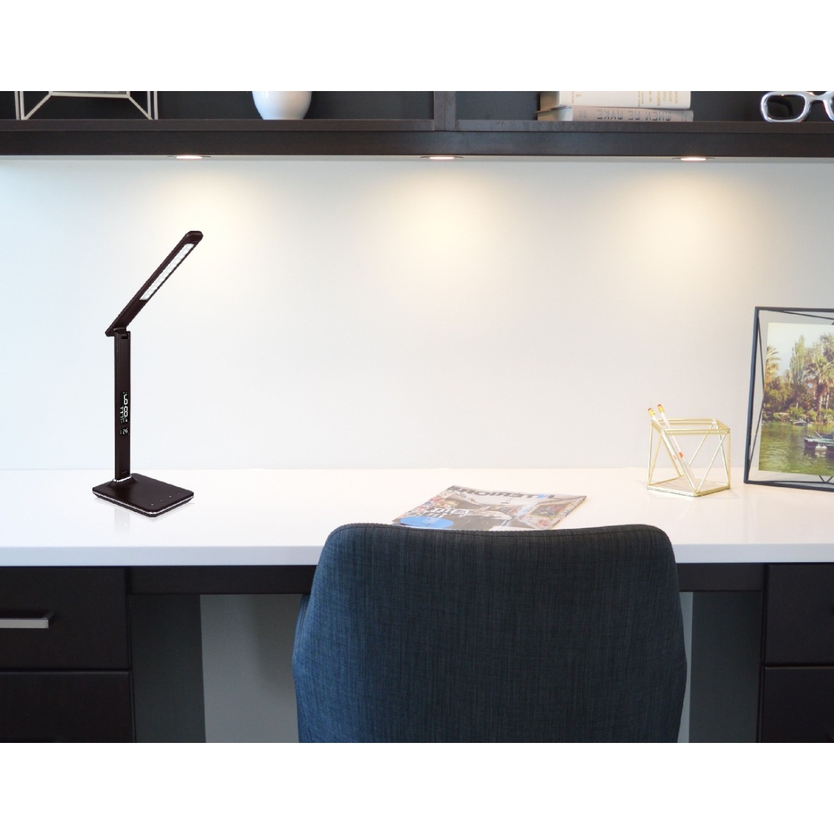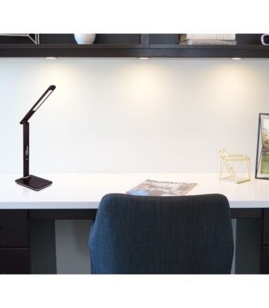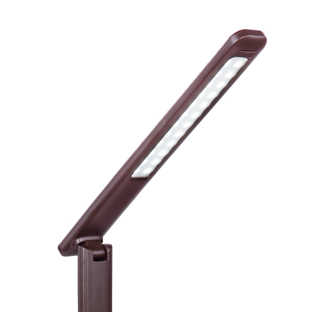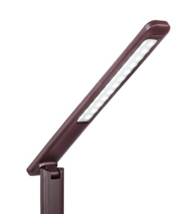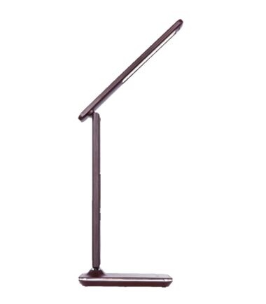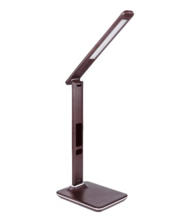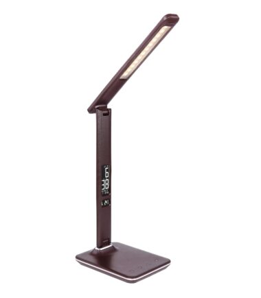 Ova stona lampa TANNA napravljena je od tamno braon plastike nakil koži u kombinaciji sa diskretnim hromiranim elementima. Displej na ovoj lampi visokoj 53cm, pruža informacije o vremenu, datumu i temperaturi. LED sijalica od 7 vati obezbeđuje do 278 lumena jake svetlosti. Svetlosna boja ovog prigušenog svetla može se promeniti ili popraviti u tri faze: topla 3000 Kelvina, neutralno bela 4500 Kelvina i hladna 5500 Kelvina. Prelepa unutrašnja lampa može se univerzalno koristiti u vašem životnom i radnom prostoru.