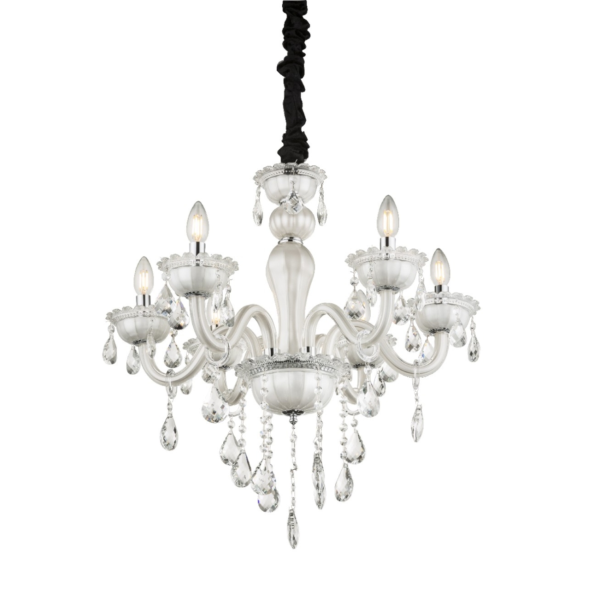 Klasični i tradicionalni stilski luster TEEJAY ističe se svojim bezvremenim dizajnom. Viseća lampa, montirana na tekstilni kabl i napravljena od belog metala, sa ukrasnim, providnim K5 kristalima, nudi vam mogućnost korišćenja bilo koje sijalice (max.40W) u šest E14 grla ugrađena u staklene abažure. Zbog uštede energije i trajnosti preporučujemo LED sijalice.