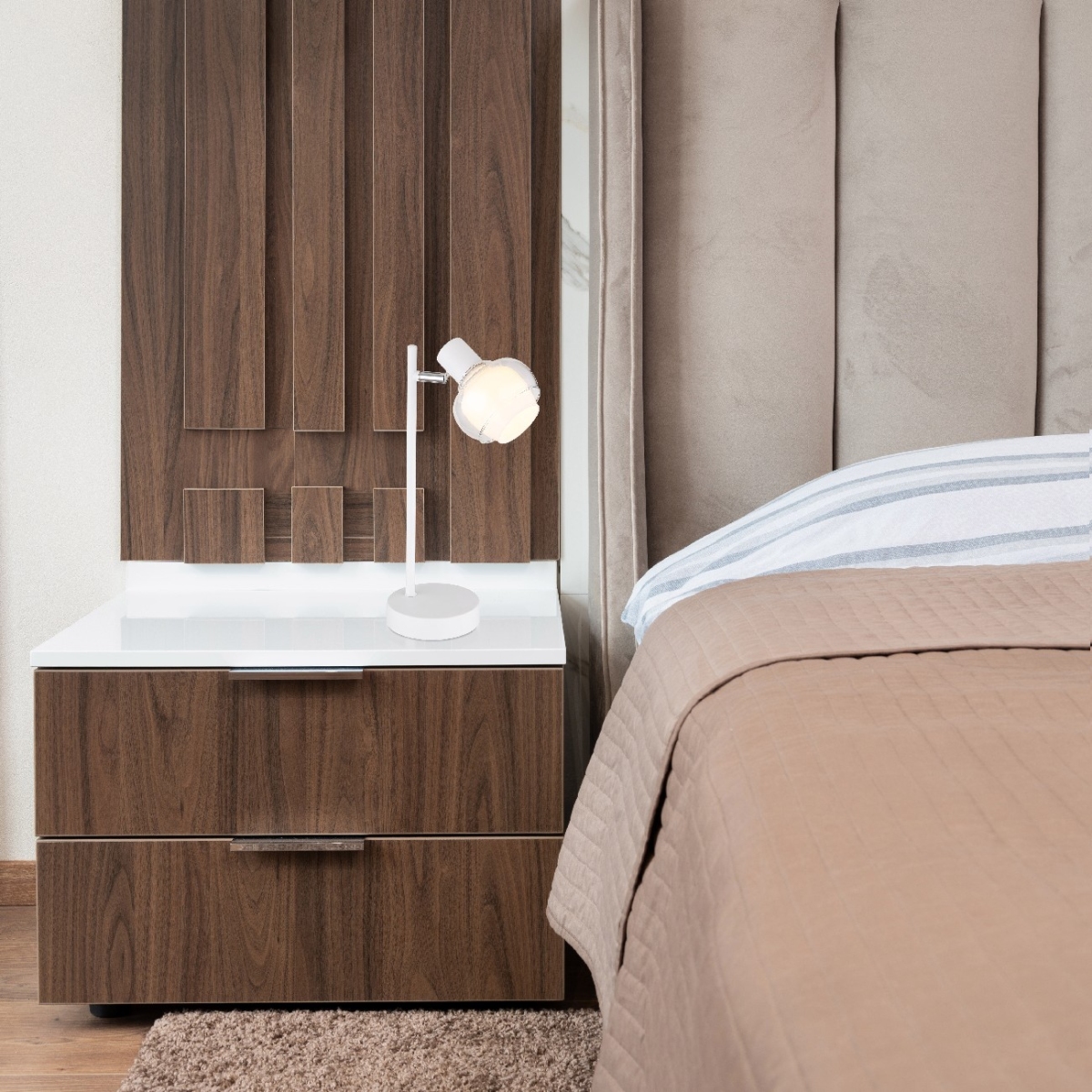 Stona lampa serije TOKKI napravljena je od belog mat lakiranog metala, providnog opal koje divno reflektuje svetlost. Svetiljka je opremljena preklopnim prekidačem na kablu i ima veličinu DxŠxV: 145x120x350 mm. Kabl je napravljen od PVC-a i bele je boje. Sijalica nije uključena u obim isporuke. Potrebna je 1 sijalica E14 od 40W. Sa svojom kombinacijom modernog dizajna i visokokvalitetnih materijala, sigurno će privlačiti pažnju u svakoj prostoriji.