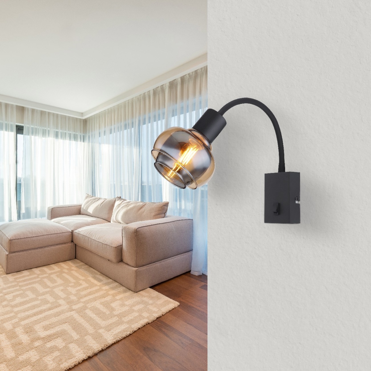 Zidna lampa serije TOKKI napravljena je od crnog mat lakiranog metala i providnog stakla u boji ćilibara i boji dima koje lepo reflektuju svetlost. Silikon je crno mat. Lampa je opremljena preklopnim prekidačem i ima dimenzije ŠxV: 105x 465 mm sa prepustom od 355 mm. Kabl je izrađen od PVC-a i crne je boje. Sijalica nije uključena u obim isporuke, potrebna je jedna sijalica E14 snage od 40W i napona od 230 volti. Privlačiće poglede u svakoj prostoriji sa svojom jedinstvenom kombinacijom modernog dizajna i visokokvalitetnim materijalima. Lampa ima praktičan preklopni prekidač i flekso granu koja vam daje mogućnost usmeravanja svetlosti u željenom pravcu. Kabl omogućava jednostavno postavljanje, dužine je 1500 mm.