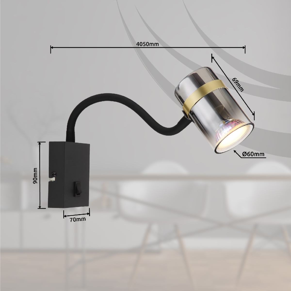 Unesite jedinstven dizajn osvetljenja u svoj dom pomoću TRABBY zidne lampe! Crno mat lakirano metalno kućište i providno staklo u boji dima daju ovoj lampi privlačan izgled. Mesingana mat metalna baza i crni PVC kabl se savršeno usklađuju. Zahvaljujući prekidaču na zidnom nosaču, imate potpunu kontrolu nad svetlom. TRABBY je takođe opremljen fleksibilnim flekso i praktičnim kablom na nosaču. Sa veličinom 70x405mm i projekcijom od 295mm, savršeno se uklapa u vaše sobe. Dužina kabla od 1500mm omogućava fleksibilan postavljanje. Grlo GU10 vam omogućava da sami odredite boju svetla i jačinu do maksimalne snage od 8 vati. Dajte svojim zidovima elegantan dodir sa TRABBY zidom lampom i stvorite udobnu atmosferu.