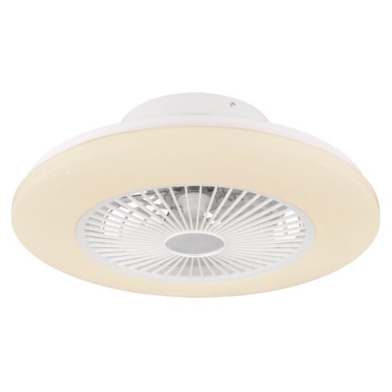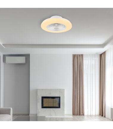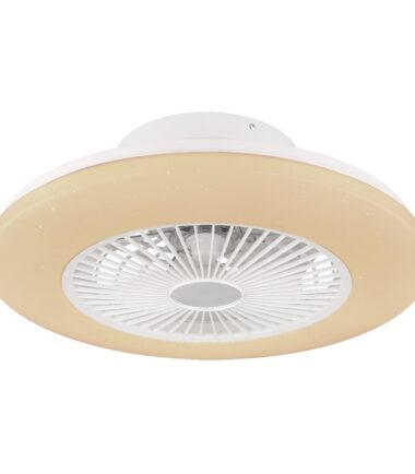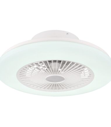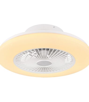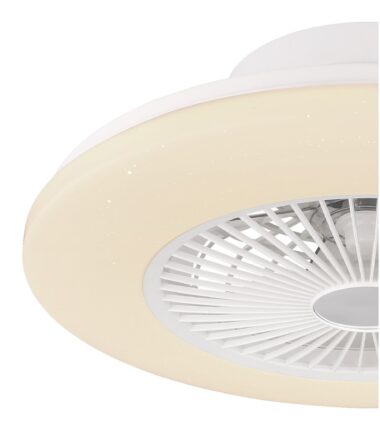 Ovaj ventilator serije TRAVO (ø 50 cm) je divan dodatak vašem enterijeru. Napravljen od belog metala, poseduje i opalni plastični prsten sa prelepim svetlucavim dekorom. Opremljen je integrisanim LED sijalicama koje obezbeđuju 1200 lumena jake svetlosti. Uz pomoć daljinskog upravljača, ne samo da možete da zatamnite svetlo, već i pojedinačno podesite boju svetla u nekoliko etapa između 3000 Kelvina (toplo bela) i 6000 Kelvina (hladno bela). Ventilator Travo može doprineti elegantnom ambijentu u vašem enterijeru. Dostupna funkcija tajmera odnosi se samo na funkciju ventilatora.