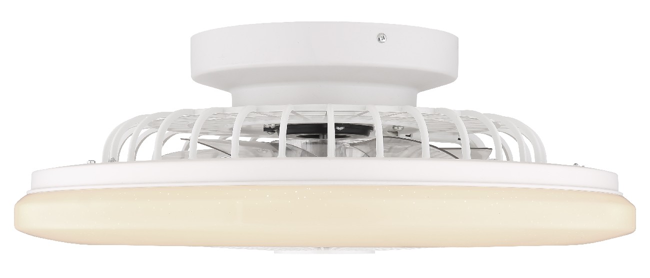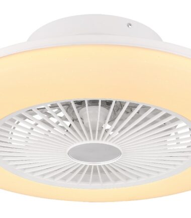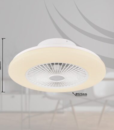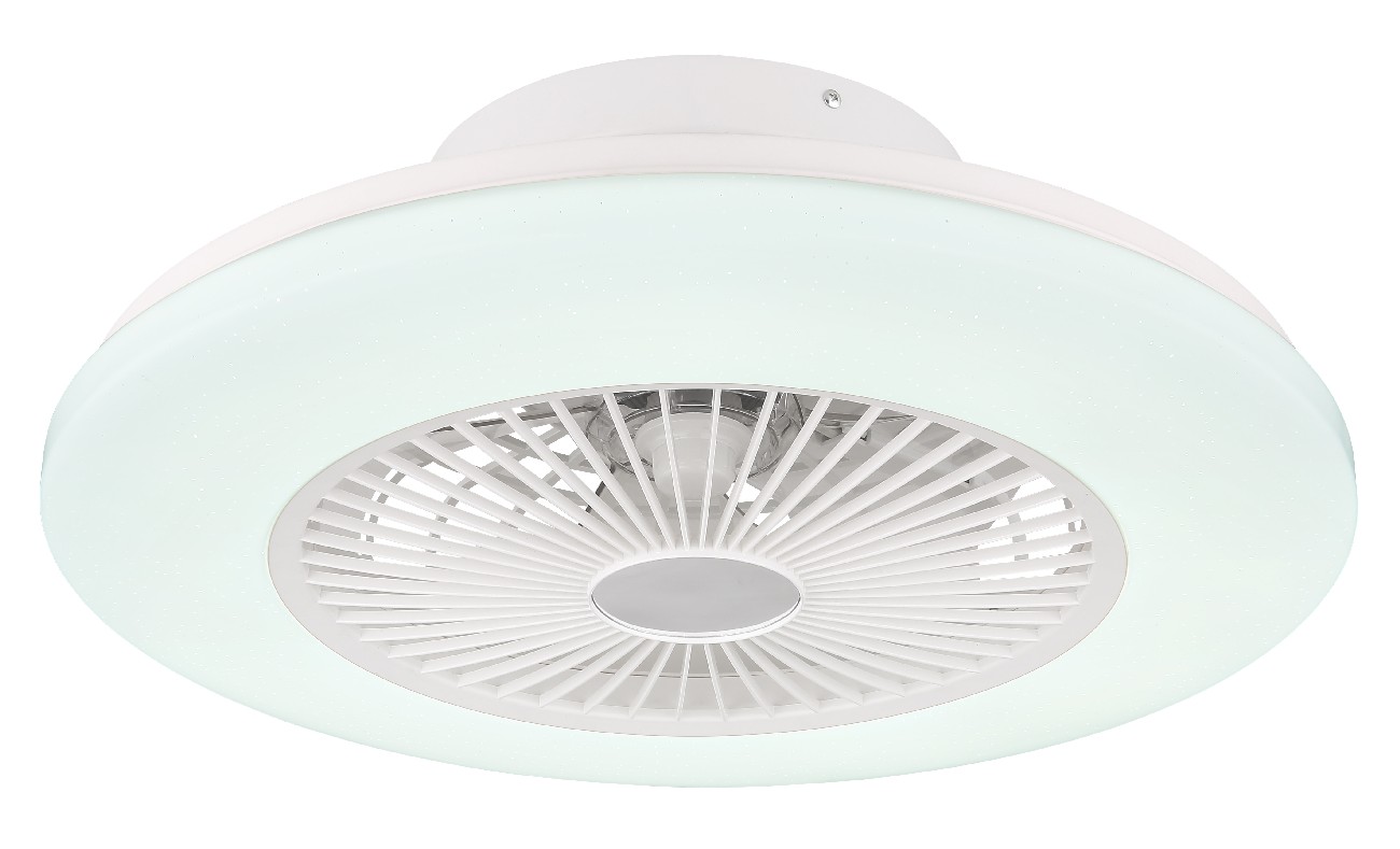 Plafonski ventilator TRAVO – stilski komfor za vaš dom Plafonski ventilator TRAVO kombinuje moderan dizajn sa raznovrsnom funkcionalnošću. Sa svojim okruglim kućištem od belog metala i plastike i elegantnim akrilnim abažurom sa opalnim završnim slojem i efektom svetlucanja, harmonično se uklapa u svako životno okruženje. Krila su diskretno smeštena unutra, što stvara minimalistički izgled. Opremljen snažnim LED osvetljenjem, ventilator nudi osvetljenost od 2600 lumena i CCT funkciju koja omogućava temperature boja od 3000K do 6500K. Integrisana funkcija memorije čuva vaša željena podešavanja, dok noćno svetlo stvara prijatnu atmosferu. Lako se kontroliše pomoću priloženog daljinskog upravljača. Možete podesiti boje svetla, prigušiti osvetljenost i koristiti tajmer posebno za ventilator. Sa prečnikom od 500 mm, TRAVO je idealan za dnevne sobe ili spavaće sobe. Doživite stilsku cirkulaciju vazduha i savršeno osvetljenje – sa plafonskim ventilatorom TRAVO!