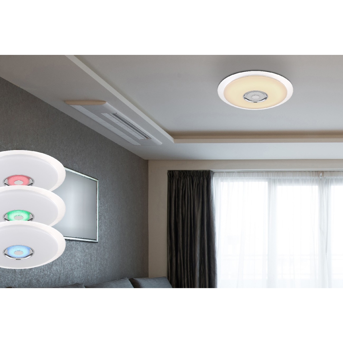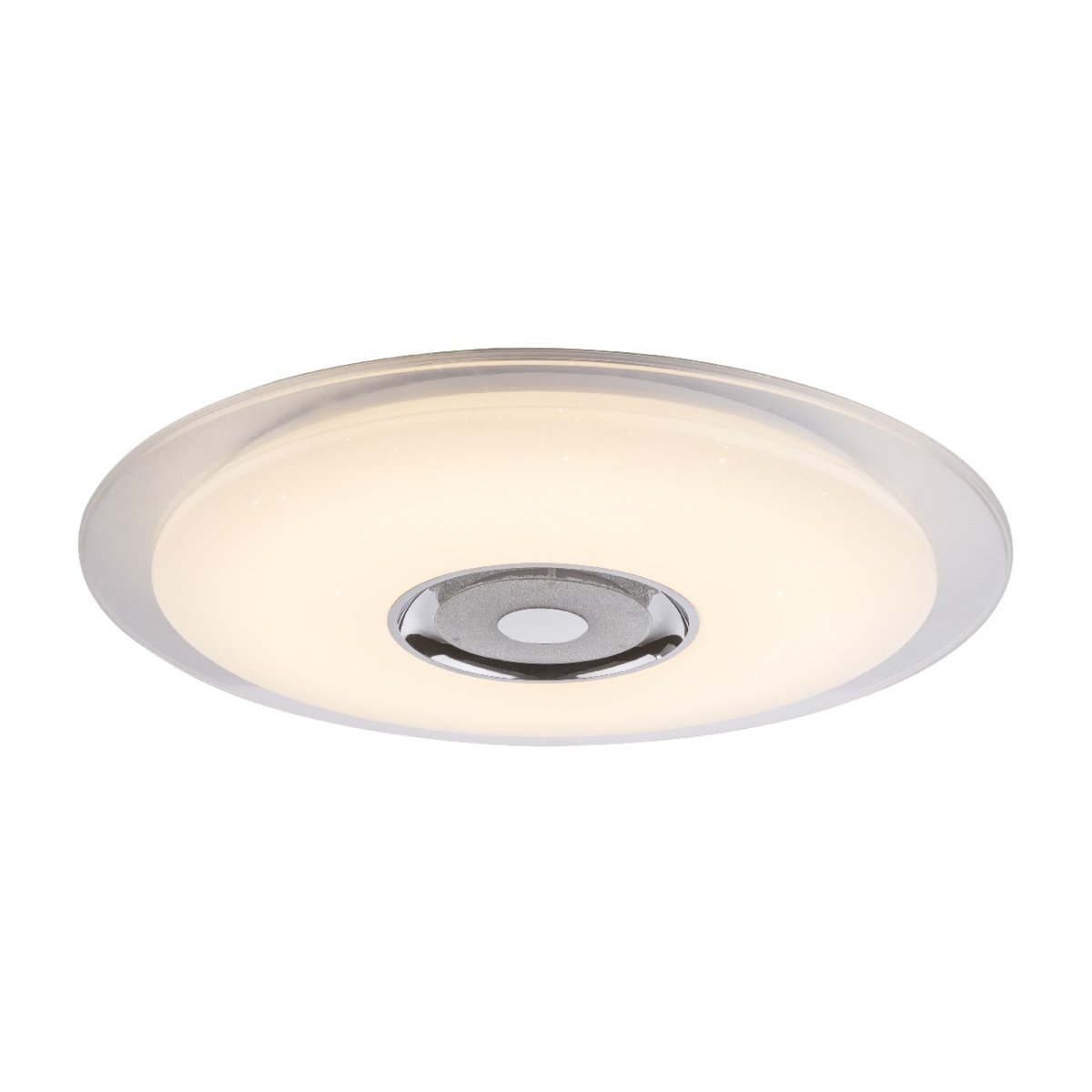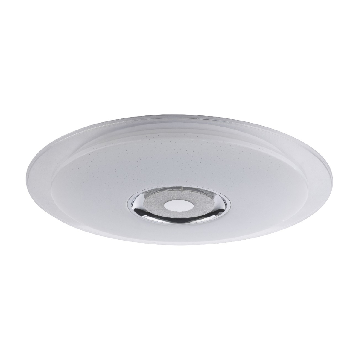 Visokokvalitetni K5 kristali i diskretan sparkle dekor na opalnom akrilnom staklu čine da ova plafonska lampa blista. Sa svojim prečnikom od 60 centimetara, on dolazi na svoje u velikim prostorijama. Iznad svega, podesite svetlo nizom fascinantnih dodatnih funkcija. Opremljena je moćnim zvučnikom koji reprodukuje muziku sa pametnog telefona putem Bluetooth veze. Uz posebno razvijenu aplikaciju, svetlosna boja i jačina svetla takođe se mogu kontrolisati sa pametnog telefona. Moćni RGBW LED-i mogu da reprodukuju sve spektralne boje i takođe proizvode belu svetlost različitog intenziteta i temperature boje. Lampa se isporučuje sa daljinskim upravljačem, koji ispunjava čitav spektar funkcija aplikacije za pametne telefone.