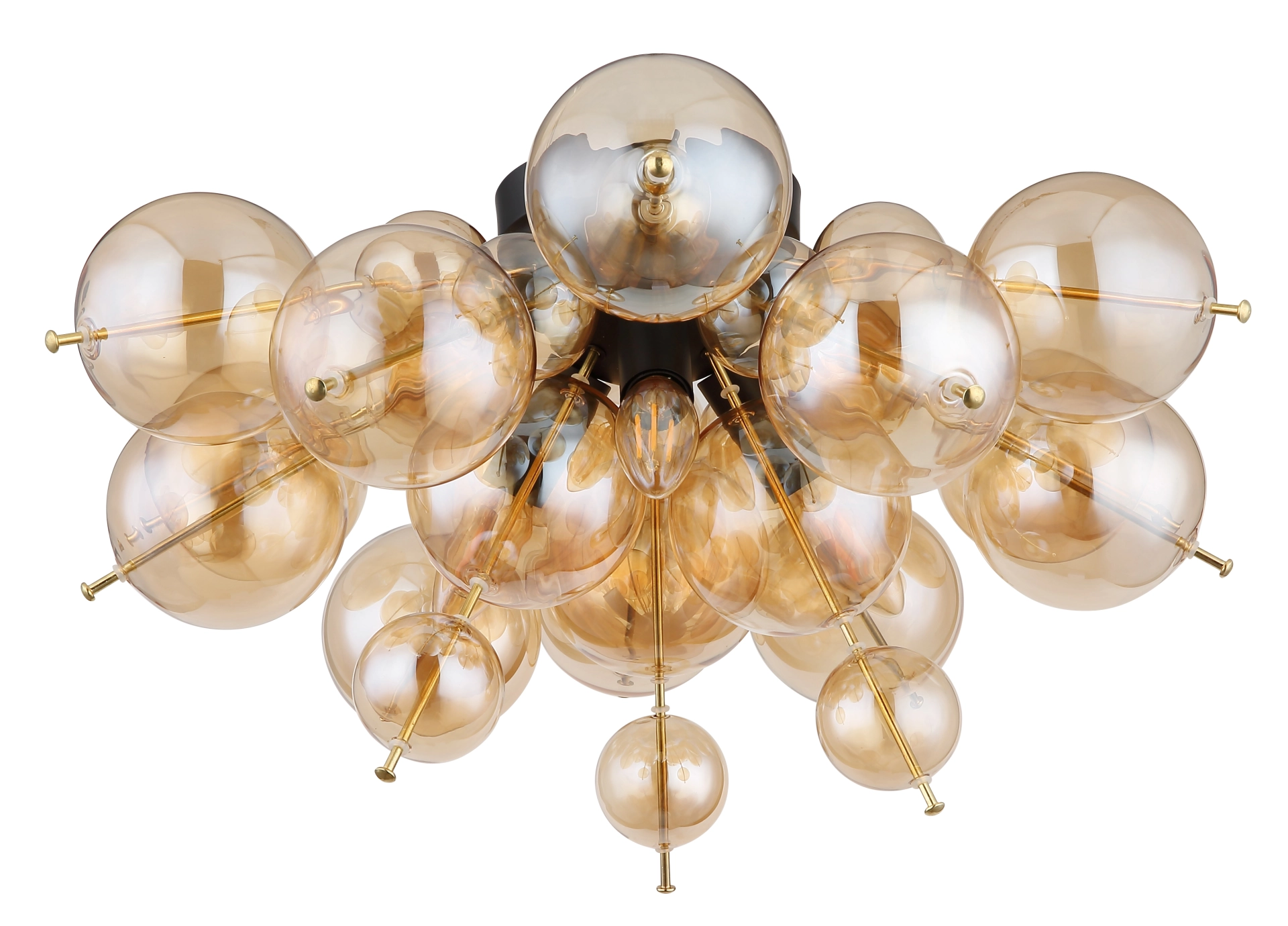 Plafonska lampa UDO je prava atrakcija za svaku prostoriju. Dizajn karakteriše okrugli oblik, gde su štapići povezani sa kuglicama različitih veličina. Telo je napravljeno od mat crnog i zlatnog metala, što pruža elegantan kontrast. Abažur plafonske lampe UDO sastoji se od staklenih sfera sa prelepim ćilibarnim izgledom. Kao rezultat toga, svetlost se toplo i udobno raspršuje. Sa prečnikom od 550 mm, plafonska lampa je dovoljno velika da efikasno osvetli prostoriju. Plafonska lampa UDO se lako montira na plafon i stvara prijatno i atmosfersko svetlo. Savršena je za dnevne sobe, spavaće sobe ili trpezarije. Ova stilska i moderna plafonska lampa će uneti karakter i stil u vaš dom. Plafonska lampa UDO je apsolutna potreba za svakoga ko želi da ulepša svoje sobe ekstravagantnim elementom osvetljenja.