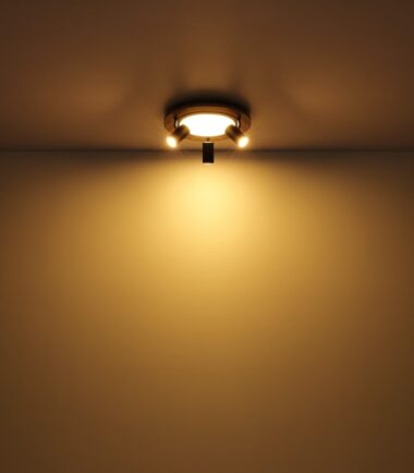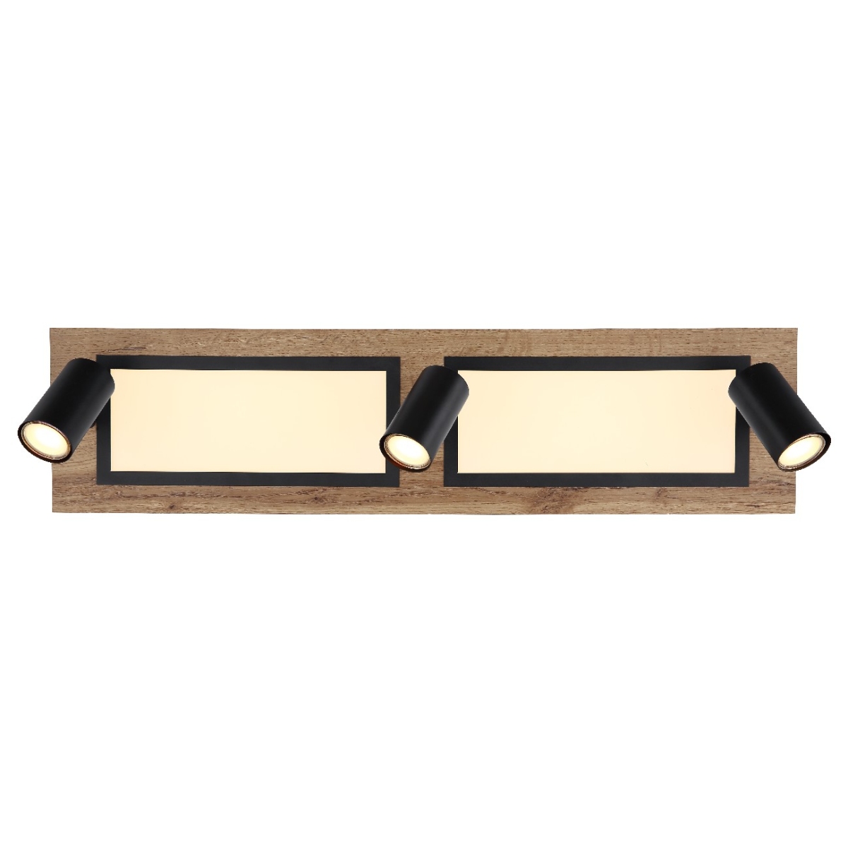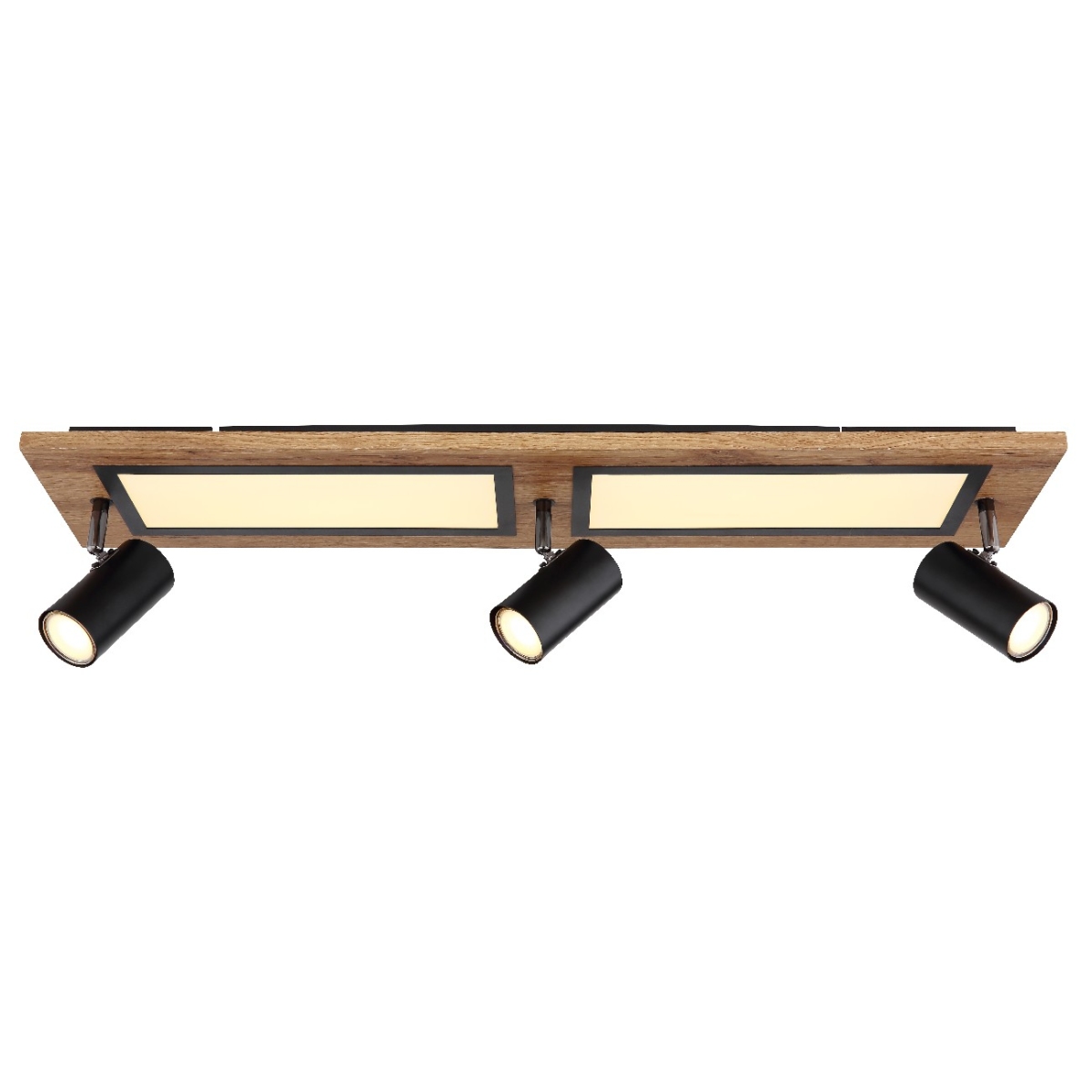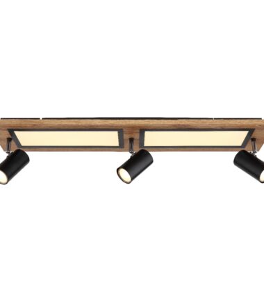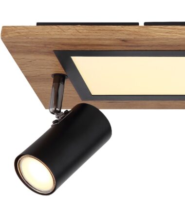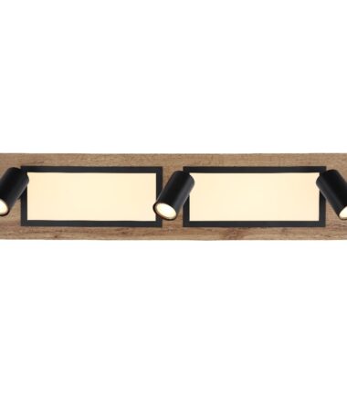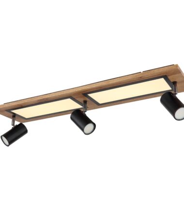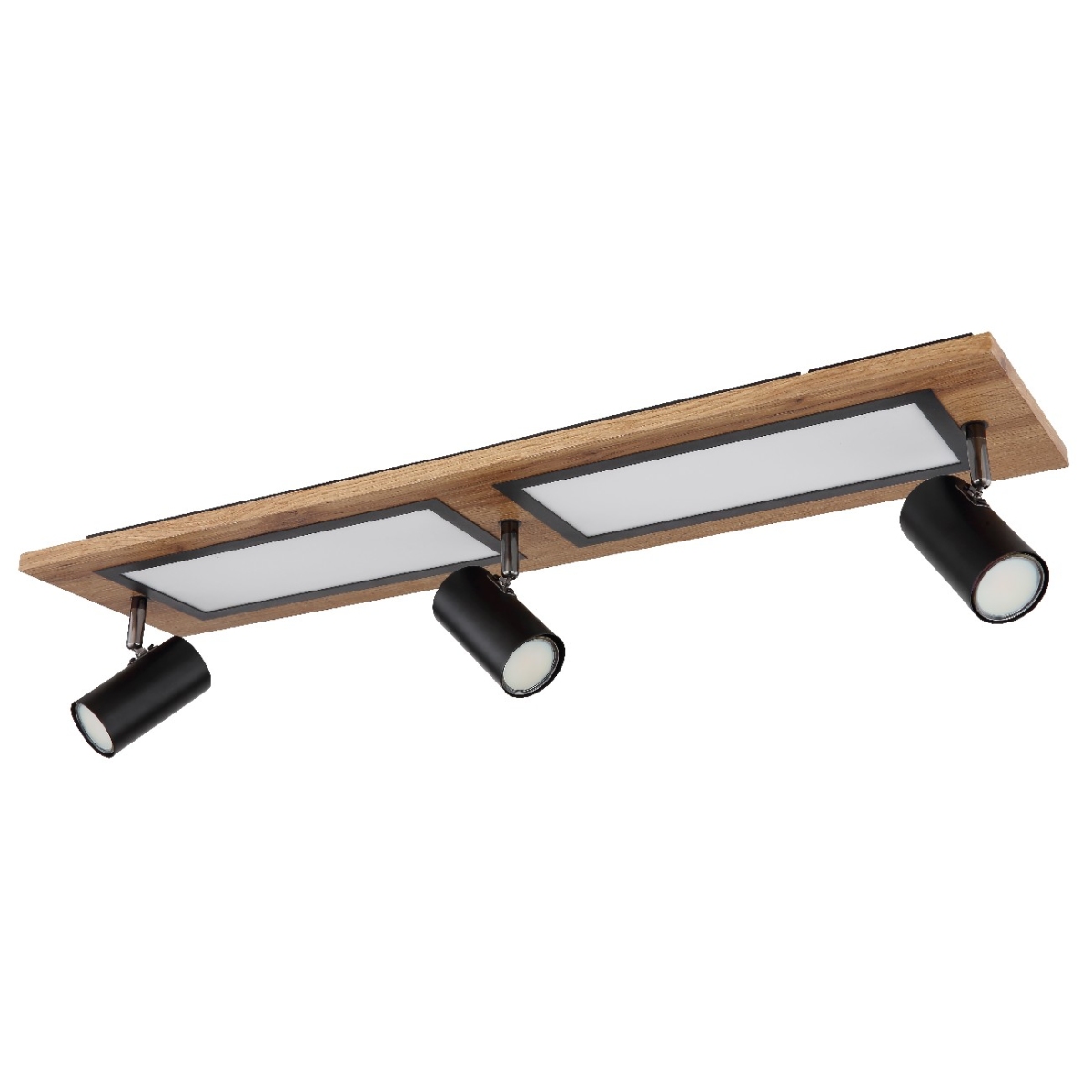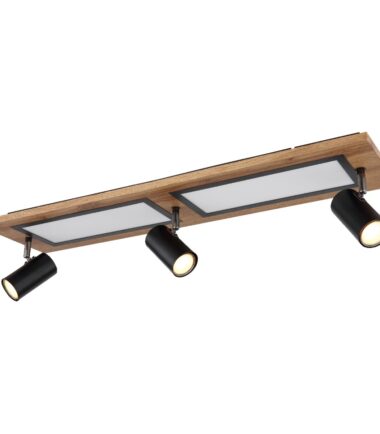 Ova sjajna plafonska lampa inspiriše svojim prelepim dizajnom. Dva LED panela nalaze na sredini pravougaonog drvenog panela (20x80xm) sa tri dodatna crno mat GU10 grla. Dva LED panela obezbeđuju prijatno 3000 Kelvina toplo belo svetlo i ima 24W. Funkcija memorije vam omogućava da zadržite poslednja korišćena podešavanja nakon isključivanja lampe.