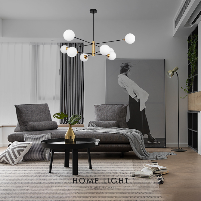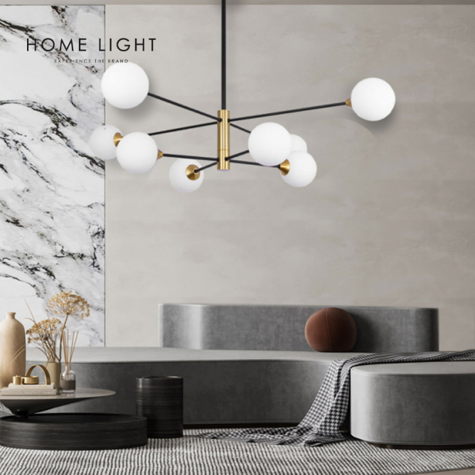 Atraktivan luster u zlatno-crnoj boji sa mlečno belim staklenim kuglama. Ovaj luster će ostaviti upečatljiv utisak raskoši u prostoru. Ima 8 sijaličnih mesta sa grlom tip G9. Boja svetlosti zavisi od izbora sijalice. Proizvod se prodaje bez izvora svetla.