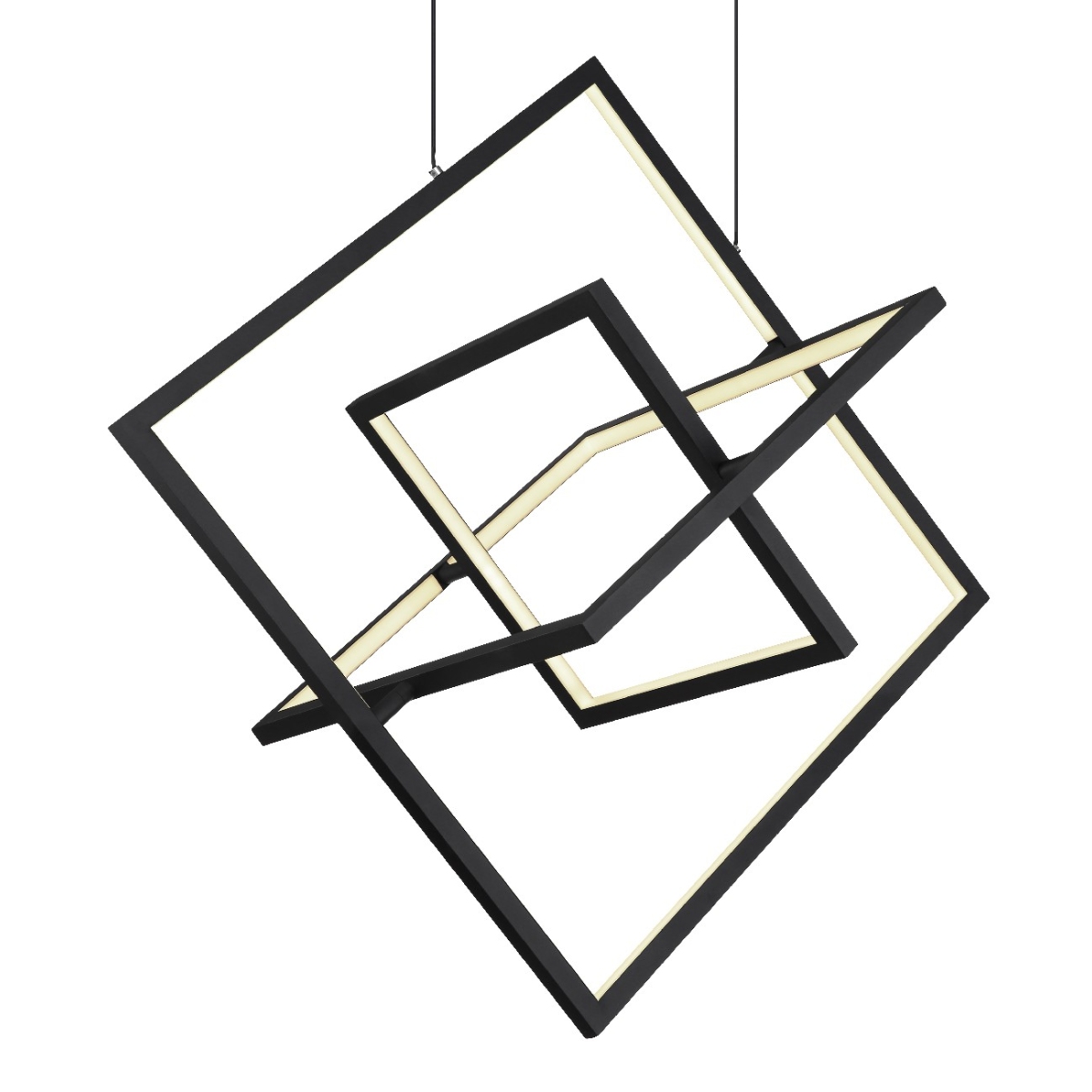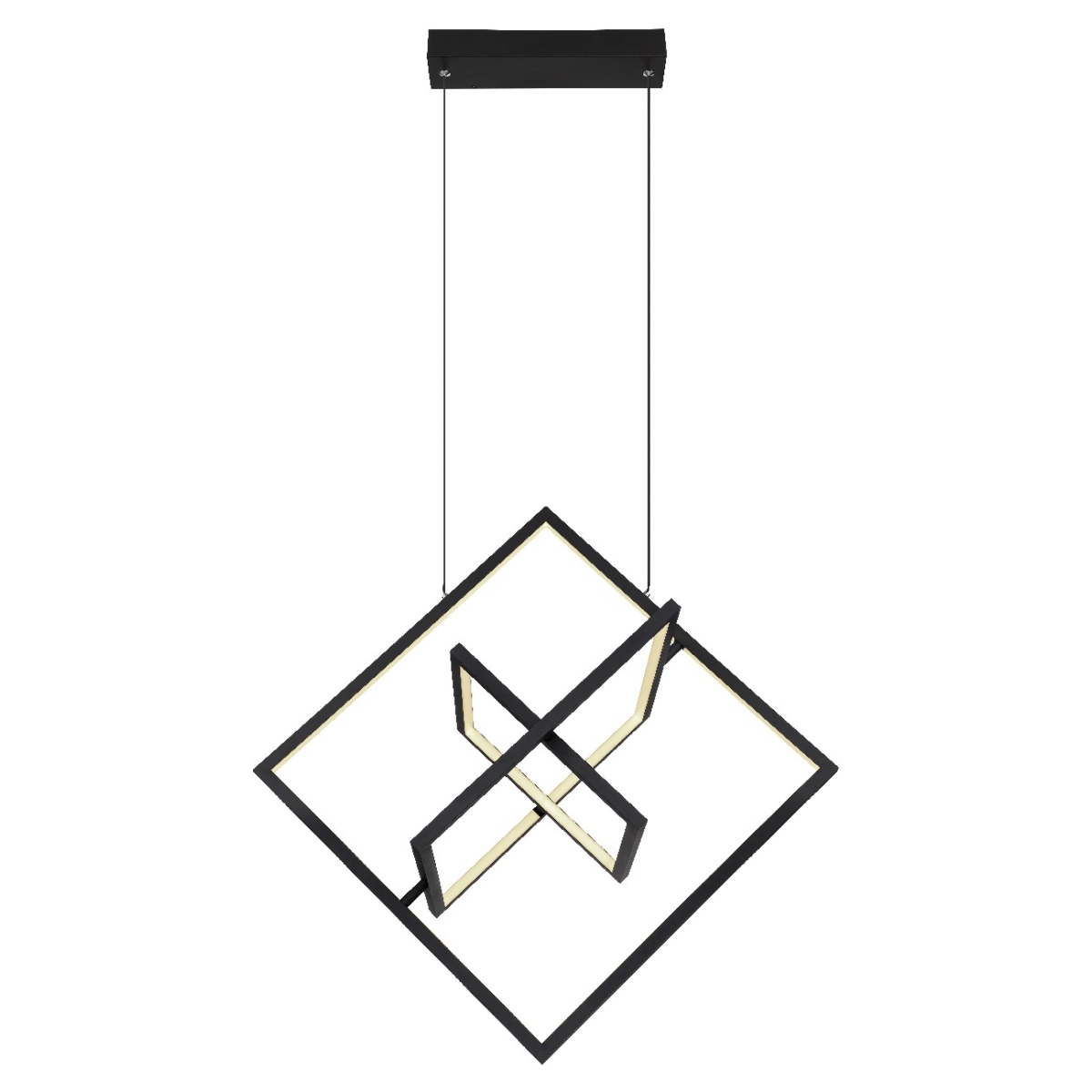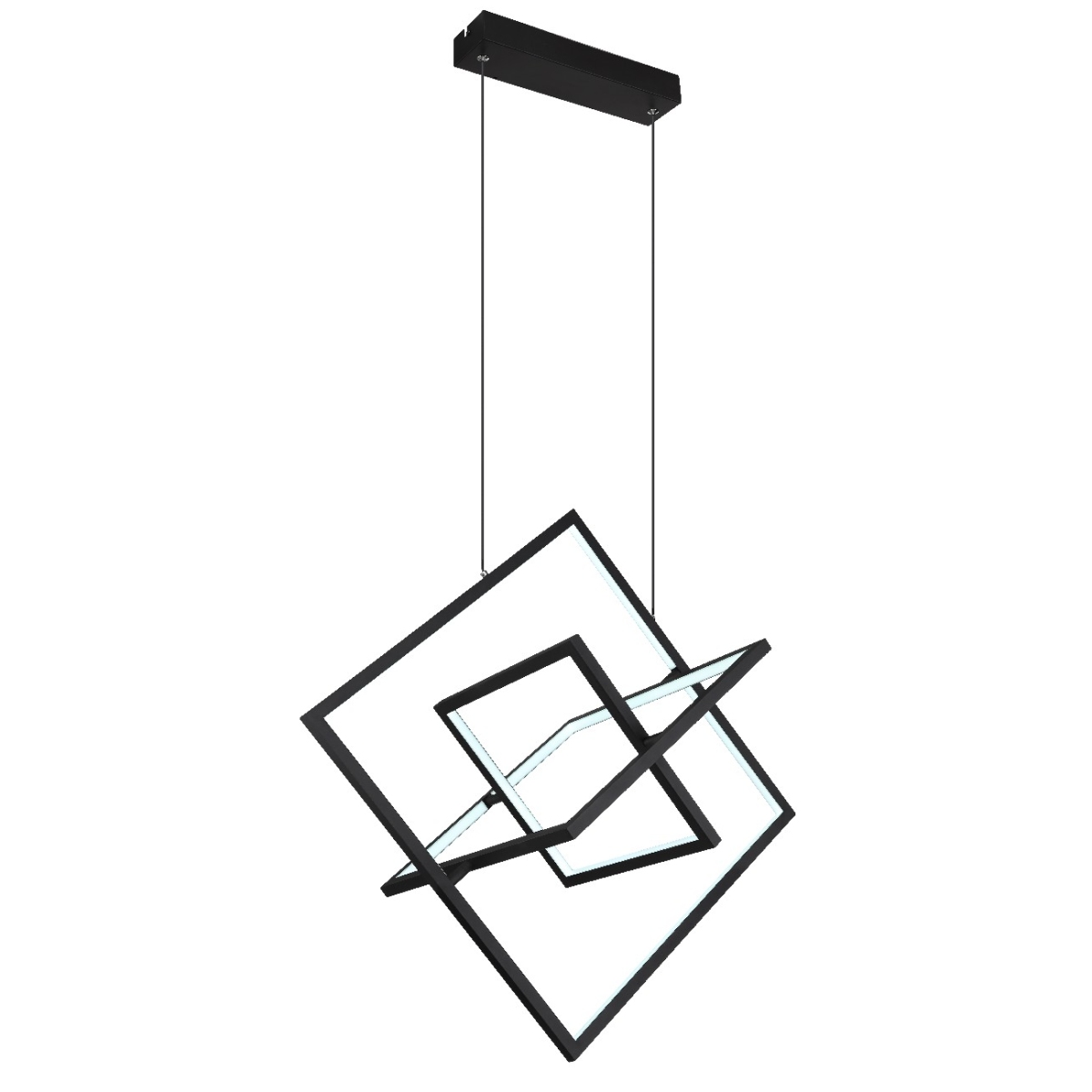 Ova moderna visilica ističe se sjajnim dizajnom i svojim funkcijama. Od pravougaone plafonske osnove napravljene od crnog metala, 2 kabla se nastavljaju do 1,5 m od plafona i vode do tri kvadratna LED panela u različitim veličinama. Ona se mogu zatamniti i fiksirati uključenim daljinskim upravljačem od 2700 Kelvina tople bele do 6000 Kelvina hladne bele svetlosti. Pored toga, lampa ima funkciju memorije, koja čuva poslednja iskorišćena podešavanja nakon isključivanja lampe i funkcije noćnog svetla za dobar noćni san.