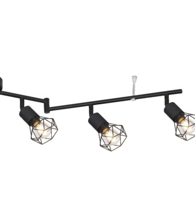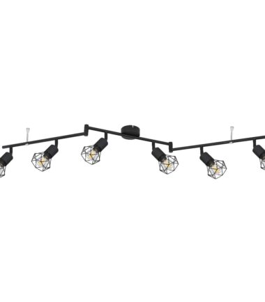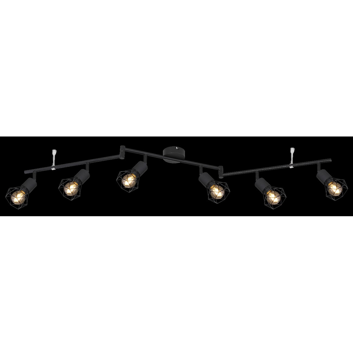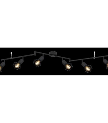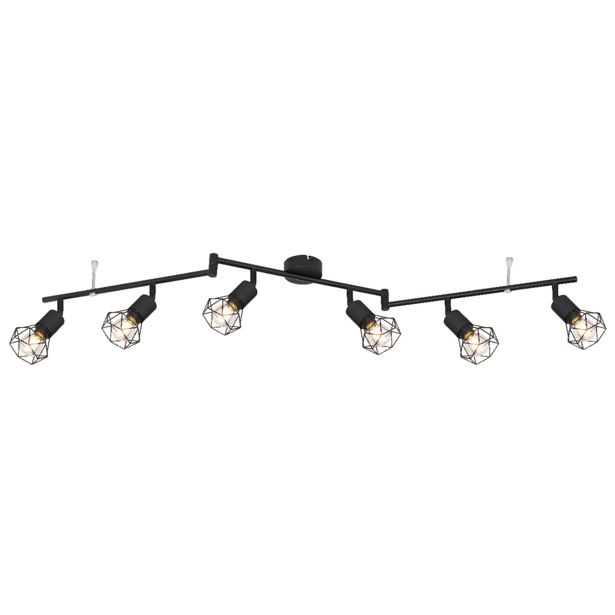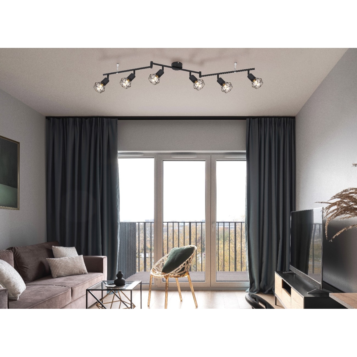 Ovaj plafonski reflektor je divan za vaš dnevni boravak. Reflektor dužine 120 cm sastoji se od tri crne metalne šipke, od kojih je srednja fiksirana za okruglu plafonsku osnovu a dve spoljne su pričvršćene za plafon. Osim toga, ima šest metalnih mrežastih abažura, koji mogu biti opremljeni E14 sijalicama po vašem izboru. To vam daje mogućnost da u skladu sa svojim idejama odredite boju svetla i jačinu.