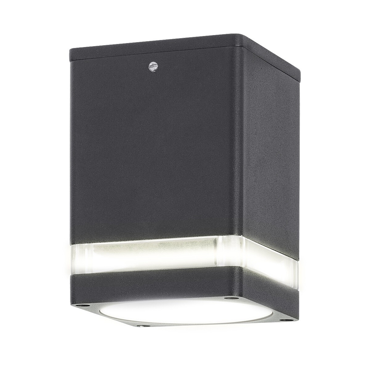 Moderna prizmatična spoljna plafonska svetiljka Zombor izrađena je od aluminijuma u antracit sivoj boji. Posebnost dizajna je u tome što je poklopac tamne boje razbijen tankom trakom providnog plastičnog abažura. Ovaj dovnlight je odličan izbor za osvetljavanje vaše terase. Zombor se može koristiti sa jednom sijalicom snage do 35W. Tip utičnice je GU10. Za stvaranje prijatne, intimne atmosfere preporučujemo da ga koristite sa sijalicom koja emituje toplu belu svetlost. Dimenzije ove spoljne plafonske svetiljke su 90x90mm, a udaljenost od plafona je 120mm. Možete ga smelo instalirati na mestima koja su manje zaštićena od kiše i prašine jer ima IP54 zaštitu koja obezbeđuje da je zaštićen od prašine i prskanja vode sa svih strana. Ova lampa se isporučuje bez izvora svetlosti.